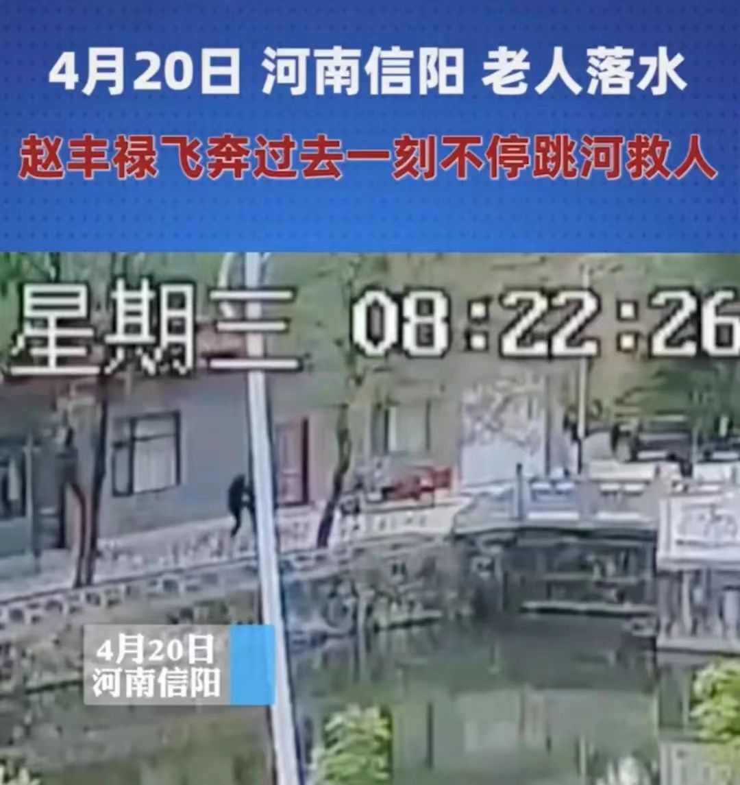 4月20日上午八时许,在信阳光山县晏河乡河棚社区许洼村郭洼组一村民沿街追打一位60多岁的邻居老太太谈广秀并将老人推进水深的池塘。不远处的赵丰禄听到老人呼救,见状立即边斥责该男子住手一边飞奔过来奋不顾身跳下有四五米落差的池塘进行施救,赵丰禄将谈广秀的头托出水面,此时谈广秀已昏迷,赵丰禄抱着谈广秀并大声呼救,在当地村民的帮助下,成功将落水的谈广秀救起。上岸之后赵丰禄来不及顾及自己刚从冰冷的池塘爬上来浑身湿透,一心担心老人的身体状况,连忙组织岸上人员进行抢救并报警。后来老人脱离生命危险,赵丰禄此时才松了口气发现自己急着救人连手机都没来得及掏出来,已经进水不能用了。