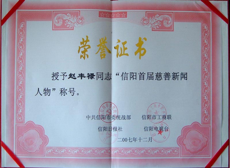 2012.12 赵丰禄董事长荣获信阳市“第三届公益慈善新闻人物”称号 2012.06 授予赵丰禄董事长“河南省光彩慈善公益优秀人物” 2011.01 2010年度河南省房地产开发优秀企业 2010.06 赵丰禄董事长荣获“信阳市第二届慈善新闻人物”称号 2010.03 2009年度信阳市房地产开发优秀企业 2009.03 2008年度信阳市房地产开发优秀企业 2008.11 荣获“河南民营企业百强”称号 2008.03 2007年度信阳市房地产开发优秀企业 2007.12 赵丰禄董事长荣获“信阳首届慈善新闻人物”称号